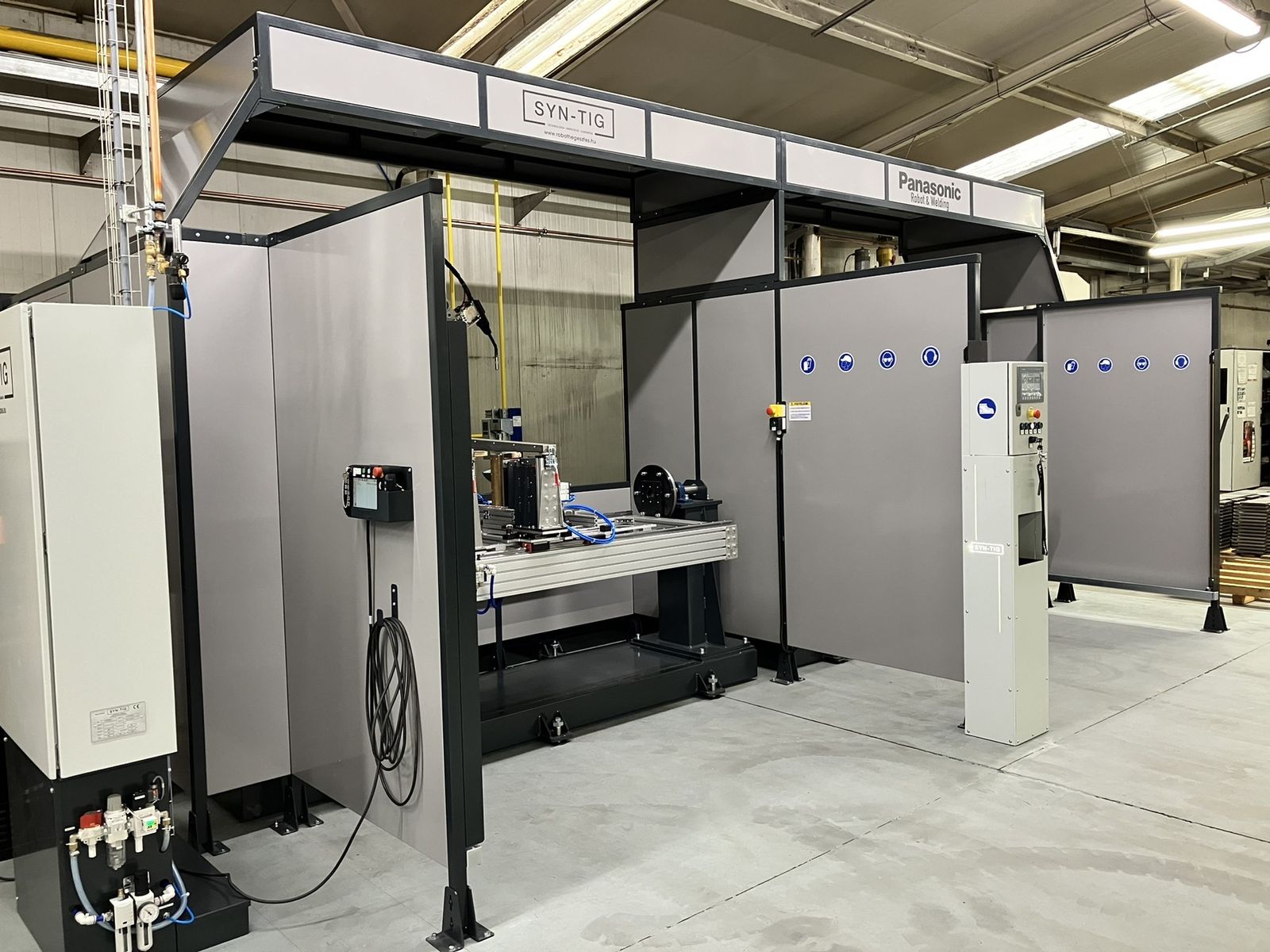 A Syn-Tig Kft. büszkén mutatja be legújabb, saját fejlesztésű Panasonic PA-E-Frame-S Szuper Aktív (S-AWP) hegesztőrobot rendszerét. A rendszer a legmodernebb automatizált hegesztési technológiát képviseli, amely precíz, megbízható és nagy sebességű hegesztést tesz lehetővé még a legösszetettebb gyártási környezetben is. A berendezés már partnerünk telephelyén bizonyít, ahol napi szinten, éles termelési környezetben dolgozik, igazolva megbízhatóságát és hatékonyságát.