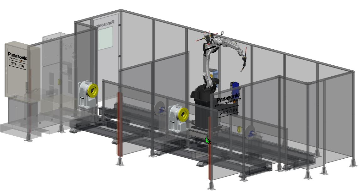Kialakítás: Panasonic PA-2PD-S hegesztőrobot rendszer, 5m utazópályával, 2 x 2m munkaterülettel.