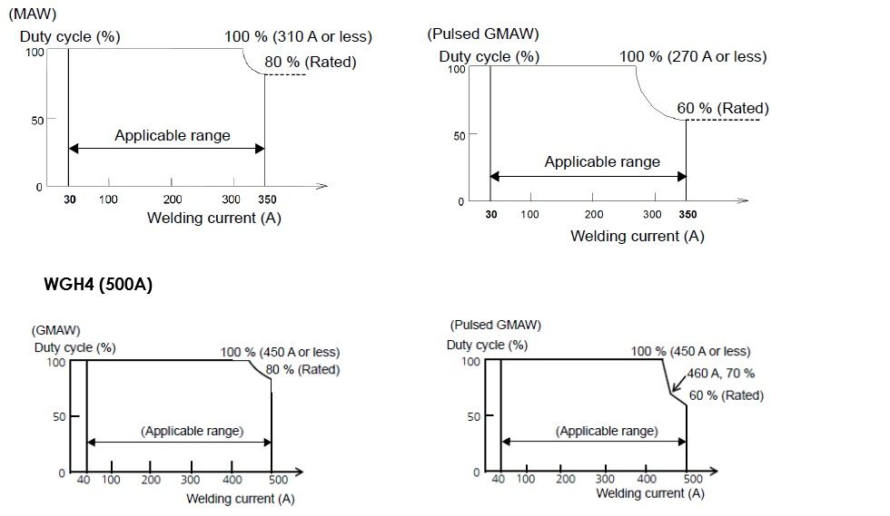 CO₂/MAG/Rozsdamentes MIG: 310 A → 100% / 350 A → 80% Pulzus MAG/Rozsdamentes MIG: 270 A → 100% / 350 A → 60% |